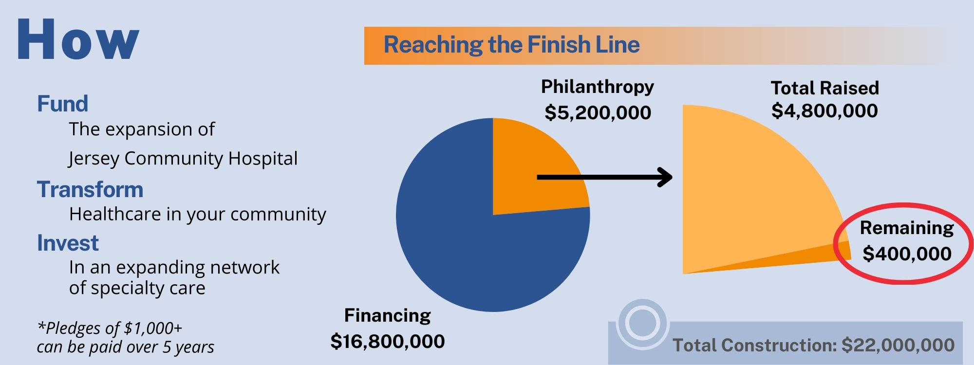 To provide the highest quality of care and meet the needs of our patients and community residents, we are embarking on a journey to fund a 30,000 square foot addition to Jersey Community Hospital to advance our surgical recovery space and bring new providers to increase the number of specialties offered right here at home.